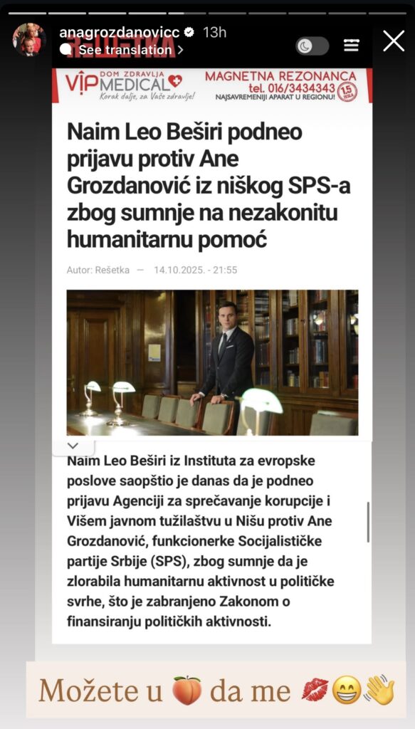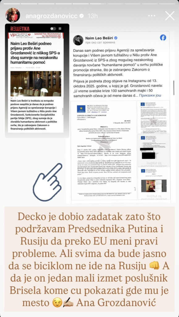 „Danas sam podneo prijavu Agenciji za sprečavanje korupcije i Višem javnom tužilaštvu u Nišu protiv Ane Grozdanović iz SPS-a zbog mogućeg nezakonitog davanja novčane ‘humanitarne pomoći’ u svrhu političke promocije stranke, što je zabranjeno Zakonom o finansiranju političkih aktivnosti.“