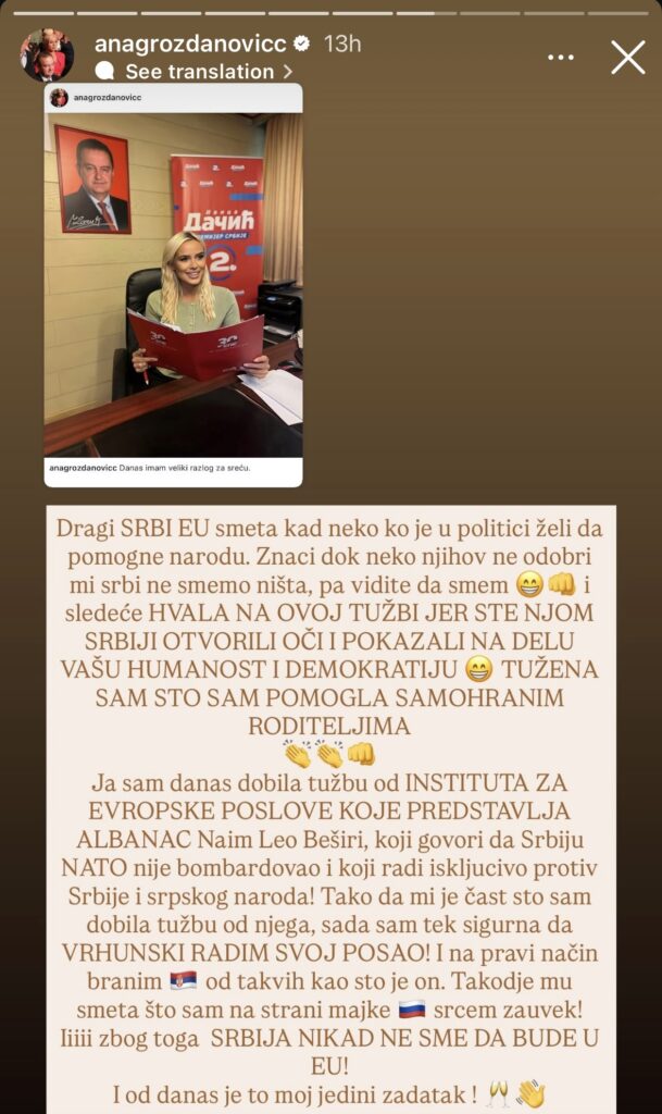 Povod za prijavu bila je objava Grozdanović na Instagramu od 13. oktobra 2025. godine, u kojoj je navela: