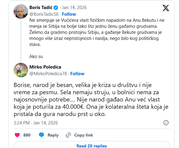 „Borise, narod je besan, velika je kriza u društvu i nije vreme za pesmu. Sela nemaju struju, u bolnici nema za najosnovnije potrebe…. Nije narod gađao Anu već vlast koja je poturila za 40.000 evra. Ona je kolateralna šteta koja je pristala da gura narodu prst u oko“, napisao je Poledica na „Iksu“.