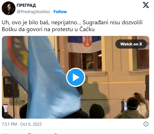 Boško Obradović, dugogodišnji lider pokreta Dveri, koji se nakon neuspeha na poslednjim izborima i koalicije sa, između ostalih, Zavetnicima, privremeno povukao iz visoke politike, a zatim ponovo aktivirao, suočio se sa negodovanjem građana u Čačku.