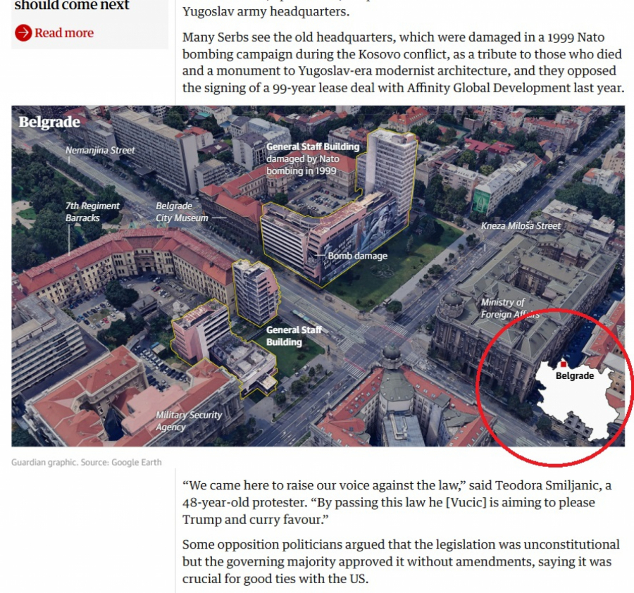 Britanski list “Gardijan” izvestio je o protestu održanom u Beogradu protiv plana da se na mestu nekadašnjeg Generalštaba izgradi hotelski kompleks. Vest prati podsećanje da je protest organizovan nakon što je Skupština Srbije usvojila leks specijalis. Uz tekst je priložena i fotografija.