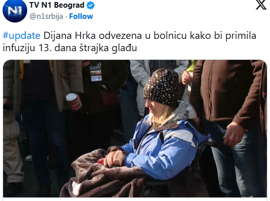 Studenti medicine iz Kragujevca uputili su apel Dijani Hrki da prekine štrajk glađu, izrazivši ozbiljnu zabrinutost za njeno zdravlje. Kako saznaje N1 od veterana koji je čuvaju, Dijana Hrka je odvezena u bolnicu kako bi primila infuziju.