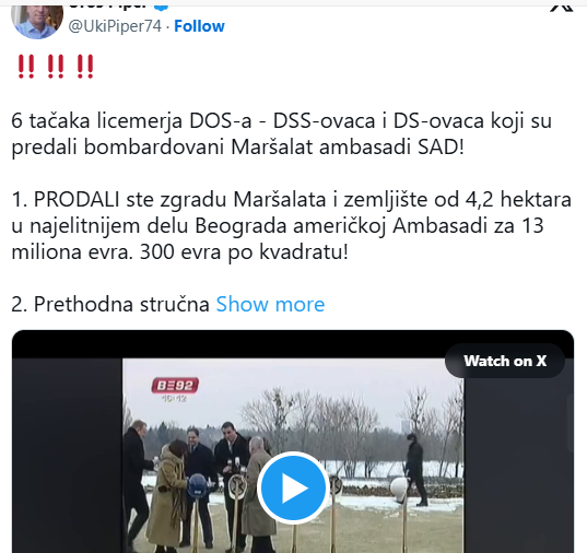 Uroš Piper je na društvenoj mreži X objavio u šest tačaka sve o prodaji Maršalata, koji su predstavnici DOS-a i DSS-a predali Amerikancima.