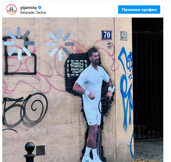 U utorak je u Beogradu uništen mural sa likom Novaka Đokovića. Reč je o delu umetnika i aktiviste Andreja Josifovskog, poznatog kao Pijanista, koje je inspirisano poznatom Novakvom gestikulacijom — tzv. „pumpanjem“ tokom ovogodišnjeg Vimbldona. Na muralu koji prikazuje Đokovića u trenutku podizanja ruku i energije, nalazio se natpis:
