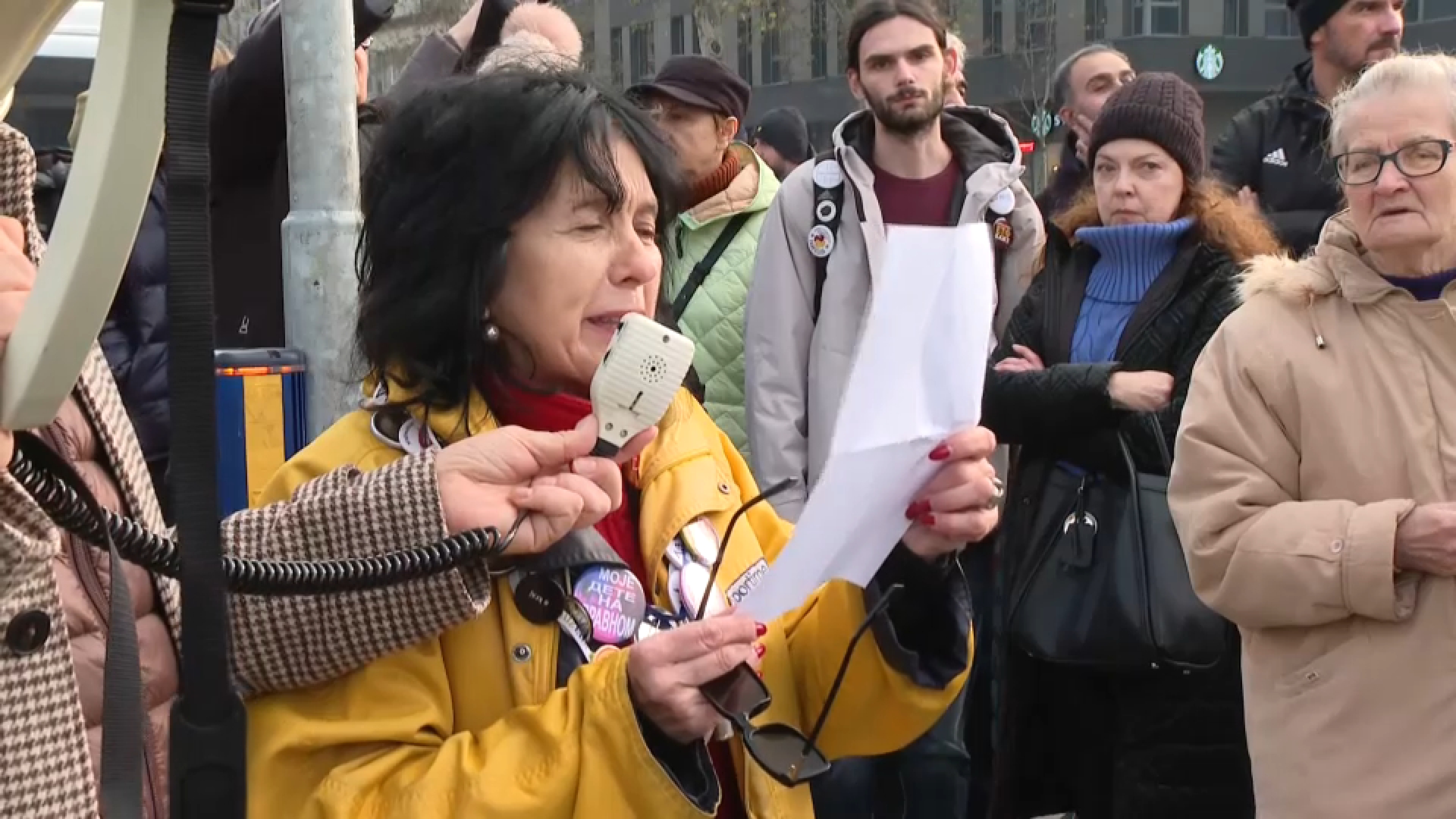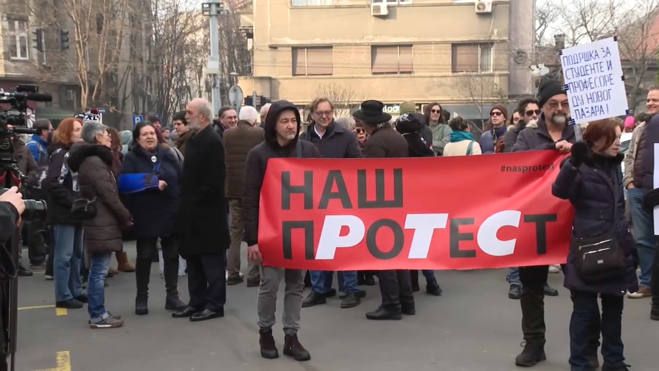 “Okupili su se glumci beogradskih pozorišta, kolege i van Beograda, radnici u kulturi, građani i radnici RTS-a. Naš protest – svi zajedno smo ovde da pozovemo građane da se u što većem broju okupe 21. decembra u Novom Pazaru da sprečimo da se DUNP ugasi. Ako smo zemlja u 21. veku koja će gasiti univerzitete umesto da ih otvara, to je sramota”, rekla je.