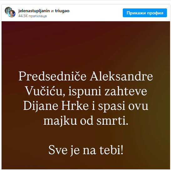 „Predsedniče Aleksandre Vučiću, ispuni zahteve Dijane Hrke i spasi ovu majku od smrti. Sve je na tebi!“, napisala je glumica na Instagramu.