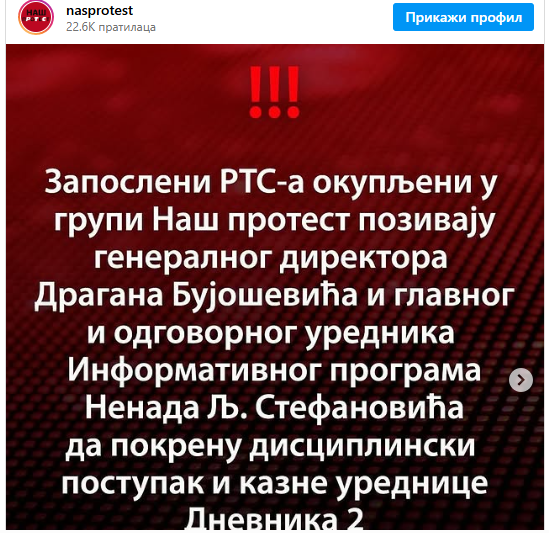 Zaposleni Radio-televizije Srbije okupljeni u grupi „Naš protest“ objavili su saopštenje na svom Instagram profilu, u kojem pozivaju generalnog direktora Dragana Bujoševića i glavnog i odgovornog urednika Informativnog programa Nenada Lj. Stefanovića da pokrenu disciplinski postupak i izreknu sankcije urednicama Dnevnika 2.