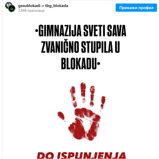 „Obaveštavamo javnost da su učenici Gimnazije ‘Sveti Sava’ u Beogradu stupili u blokadu nastave do ispunjenja zahteva koje su postavili učenici Pete beogradske gimnazije.
