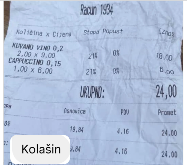 U konkretnom slučaju, kapućino je naplaćen 6 evra, odnosno oko 700 dinara, dok je čaša kuvanog vina koštala čak 18 evra, više od 2.100 dinara. To su iznosi koji ne odudaraju samo od prosečnih cena u regionu, već i od cena u pojedinim zapadnoevropskim turističkim destinacijama.
