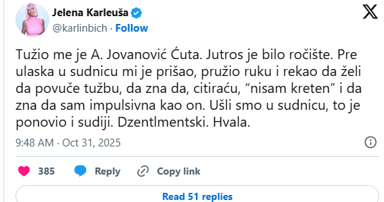 „Tužio me je A. Jovanović Ćuta. Jutros je bilo ročište. Pre ulaska u sudnicu mi je prišao, pružio ruku i rekao da želi da povuče tužbu, da zna da, citiraću, ‘nisam kreten’ i da zna da sam impulsivna kao on. Ušli smo u sudnicu, to je ponovio i sudiji. Džentlmenski. Hvala“, napisala je pevačica.