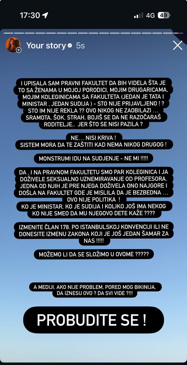 Pevačica je dodala: „Na Pravnom fakultetu smo par koleginica i ja doživele seksualno uznemiravanje od profesora. Jedna od njih je pre njega doživela ono najgore i došla na fakultet gde je mislila da je bezbedna. Izmenite član 178 po Istanbulskoj konvenciji ili ne donosite izmenu zakona koji je još jedan šamar za nas.“ Takođe je poručila: „Ministar lupa gluposti oko konvencije. Učio je da položi ispit i da ide kući. A ja je znam celu! Ili ne diraj ili izmeni kako treba! Ovo utiče na decu (devojčice i dečake), žene i bake.“
