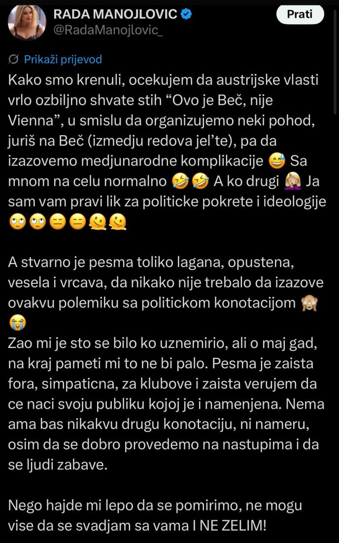 Rada Manojlović nedavno je objavila novu pesmu pod nazivom „Na putu do Beča“, koja se za kratko vreme našla na 15. mestu YouTube trending liste.