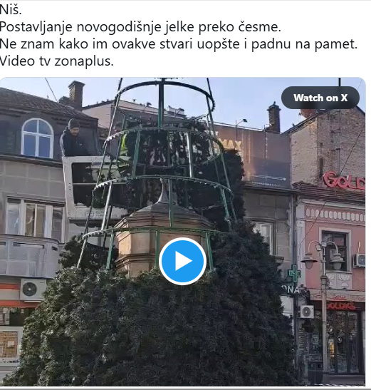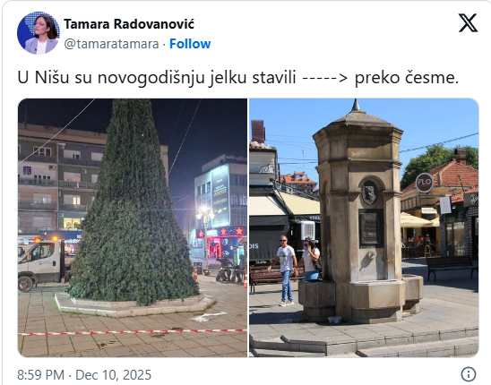 Gradovi širom Srbije ovih dana dobijaju svoje novogodišnje ukrase, ali društvene mreže uglavnom ključaju od smeha i neprijatnosti. Najnoviji primer dolazi iz Niša, gde je novogodišnja jelka postavljena direktno preko gradske česme.