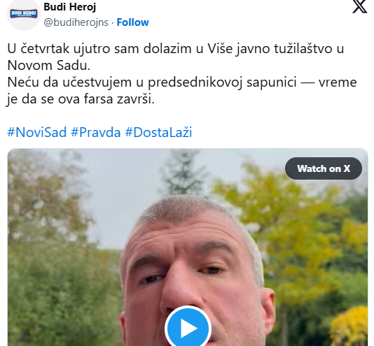 Bačulov se potom oglasio na društvenoj mreži Iks, gde je pozvao nadležnog tužioca da ga primi i uzme izjavu o svemu što ga zanima.