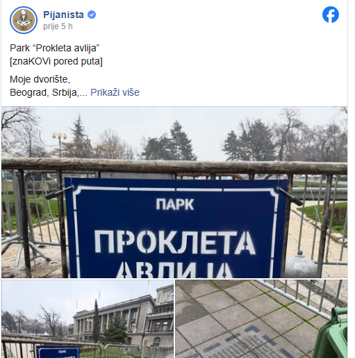 Novo „remek-delo“ poznatog beogradskog umetnika i arhitekte, poznatog pod pseudonimom Pijanista, pojavilo se na ogradi nehigijenskog naselja poznatog kao „ćacilend“. Umetnik je na ogradu postavio tablu sa natpisom „Prokleta avlija“.