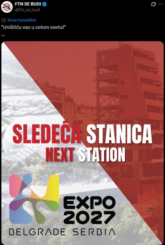 Studenti sa Fakulteta tehničkih nauka nedavno su na svom profilu na društvenim mrežama podelili fotografije Generalštaba i Ekspo 2027, uz opis „sledeća stanica“.
