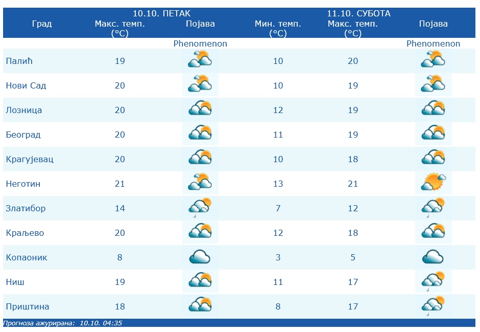 Danas će na severu Srbije pre podne biti pretežno sunčano, dok se u drugom delu dana i uveče očekuje prolazno naoblačenje. U ostalim krajevima zemlje biće umereno do potpuno oblačno, mestimično uz slabu i kratkotrajnu kišu – pretežno ujutru i tokom prepodneva, kao i u brdsko-planinskim predelima. Kiša je moguća i ponovo tokom noći između petka i subote.