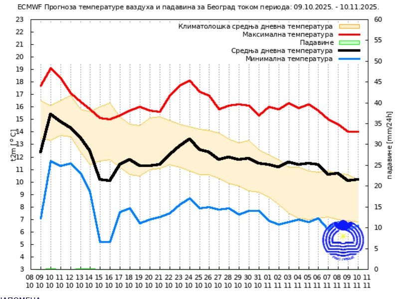 Prema trenutno dostupnim podacima iz dugoročne prognoze Republičkog hidrometeorološkog zavoda za narednih 30 dana, očekuju se relativno stabilni vremenski uslovi sa temperaturama do 19 stepeni Celzijusa sve do kraja oktobra. Najniže noćne temperature biće oko 6 stepeni u periodu između 14. i 17. oktobra. Najtopliji dan u ovom periodu očekuje se 19. oktobra, nakon čega će temperature postepeno opadati. Početkom novembra maksimalna dnevna temperatura bi, prema trenutnim procenama, mogla iznositi oko 16 stepeni, dok će noćne vrednosti povremeno padati ispod 6 stepeni.