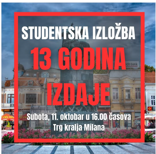 Niški studenti koji su u blokadi pozvali su svoje sugrađane da danas, 11. oktobra u 16 časova, posete izložbu pod nazivom „13 godina izdaje“, koja će biti postavljena na Trgu kralja Milana, kod spomenika Kralju Milanu. Izložba je posvećena, kako navode, odnosu režima Aleksandra Vučića prema srpskom narodu i institucijama na Kosovu i Metohiji.