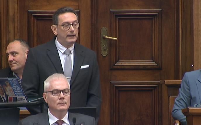 „Znači, 4. jula, studenti u blokadi, oni koje je organizovao onaj njihov Roleks pa dobio stipendiju pa posle pobegao u Nemačku, kažu stanite uz studente… Ovaj konkretno podržao to i rekao mi se priključujemo, bojkotovaćemo rad Skupštine, nećemo da dolazimo na sednice… I evo ga ovde, znate zašto? Zato što se drži za tu skupštinsku fotelju ko pijan za plot, ni pod razno da je pusti… Zato što zna da će ono što je pre neki dan rekao Benjamin Netanjahu njima da se desi… Ko hrani krokodila, doći će jednog dana da ga pojede! E to im dolazi sada, isti oni koji su ih hranili sada će da dođu da ih izbace iz ove Skupštine! I zato je danas ovde da pokuša nekako da pretekne pošto ga neće na svoju listu a svoju ne može da napravi da pređe 3 posto.“