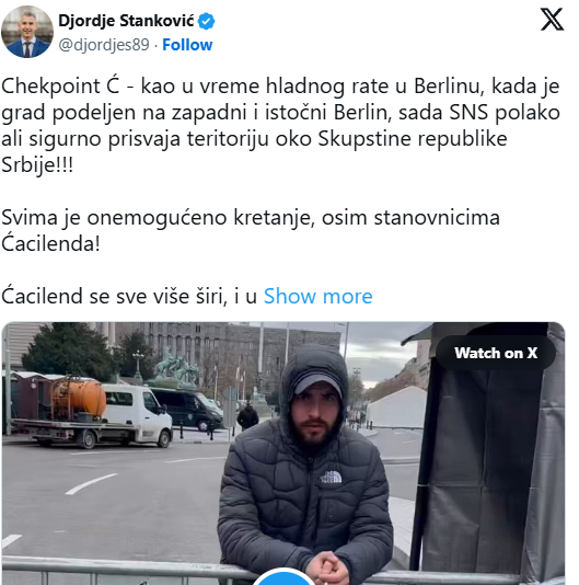 Poslanik Narodnog pokreta Srbije Đorđe Stanković podelio je snimak na kojem se vidi kako narodni poslanici ulaze u zgradu Skupštine Srbije, pri čemu prethodno moraju da prođu kroz „obezbeđenje“ takozvanog Ćacilenda.