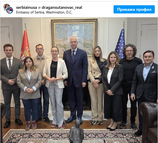 Na zajedničkoj fotografiji iz Ambasade Srbije u SAD nalaze se ambasador Dragan Šutanovac, poslanici Srpske napredne stranke Milan Radin i Darko Jovanović, Sanja Ćalović iz Socijalističke partije Srbije, Ana Oreg iz Pokreta slobodnih građana i Natalija Stojmenović iz Zeleno-levog fronta.