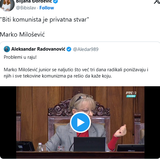 Poslanik Socijalističke partije Srbije i unuk Slobodana Miloševića, Marko Milošević, danas je na sednici Skupštine odgovorio Marijanu Rističeviću iz Srpske napredne stranke, započevši svoje izlaganje rečenicom „biti komunista je privatna stvar“.