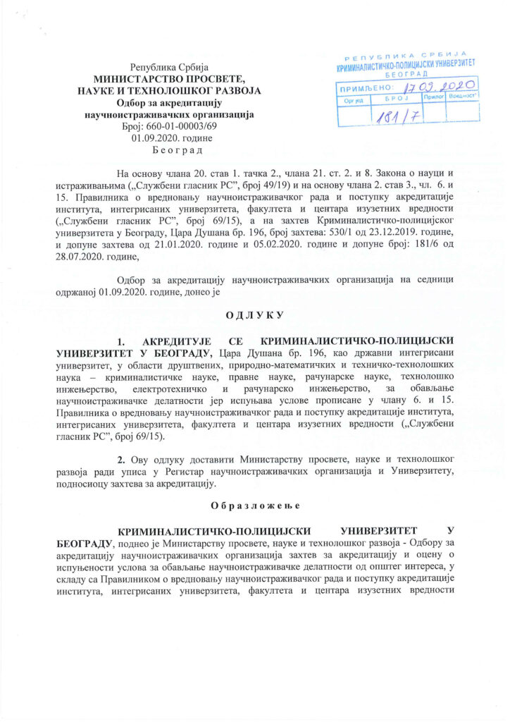Na sajtu KPU dostupna je akreditacija od 1. septembra 2020. godine, u kojoj se navodi da Univerzitet ima i realizuje program naučnoistraživačkog rada, razvija naučnoistraživački podmladak, poseduje naučno-informativnu dokumentaciju i bibliotečko-informativni centar, te obavlja transfer znanja i tehnologije. Ova, do nedavno visokoškolska ustanova, u okviru svog delovanja pokrivala je oblasti kriminalistike, tehnologije, informatike i drugih naučnih disciplina. Međutim, od 1. septembra ove godine, sve to je postalo prošlost.