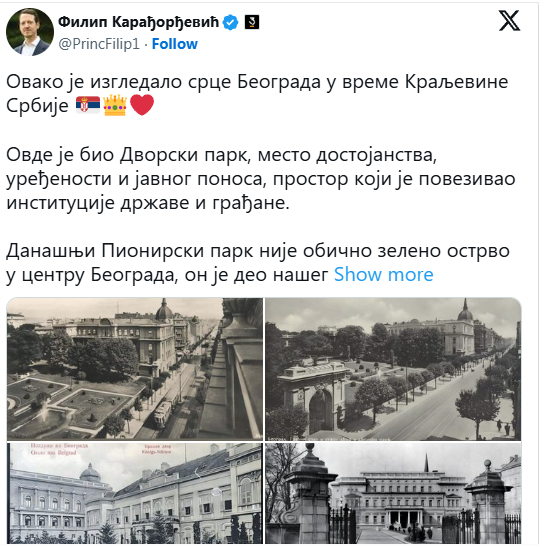 Princ Filip Karađorđević podelio je na društvenoj mreži X stare fotografije centra Beograda, gde se danas nalazi šatorsko naselje poznato kao „ćacilend“, podsećajući kako je taj prostor izgledao u vreme Kraljevine. Istakao je da bi taj deo grada trebalo da ostane simbol urednosti i mira, a ne „slika zapuštenosti i političkih sukoba“.