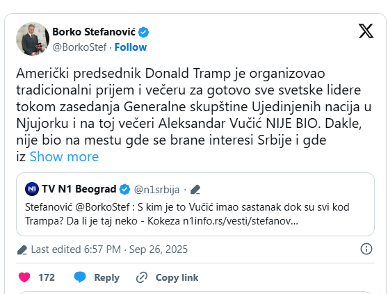 Prvo je Stefanović objavio tvit u kojem tvrdi da će jedini evropski zvaničnici koji će izostati sa Trampove večere biti Vladimir Putin, Aleksandar Lukašenko i, kako navodi, Aleksandar Vučić. Potom je reagovao ministar spoljnih poslova Marko Đurić, poručivši da je Vučić dobio poziv od Trampa i njegove administracije, ali da je, ukratko, imao preča posla — bilateralne sastanke u isto vreme. U svom najnovijem tvitu Stefanović dovodi u pitanje Đurićeve „dokaze“.