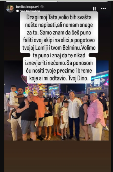 „Dragi moj tata, voleo bih svašta nešto napisati, ali nemam snage za to. Samo znam da ćeš puno faliti ovoj ekipi na slici, a pogotovu tvojoj Lamiji i tvom Belminu“, napisao je Dino.