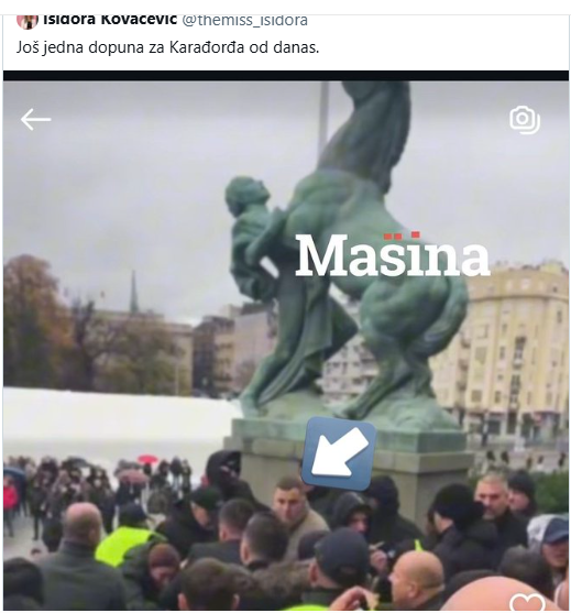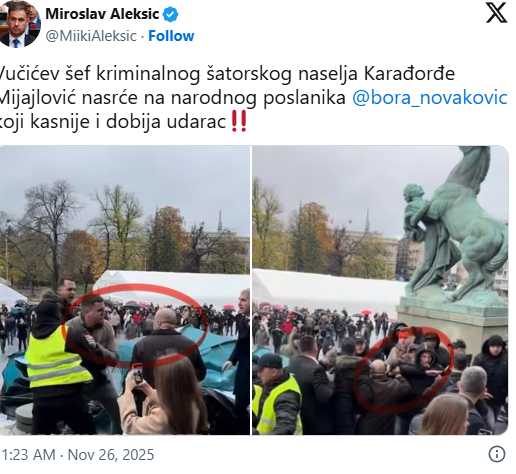 „Vučićev šef kriminalnog šatorskog naselja Karađorđe Mijailović nasrće na narodnog poslanika Borislava Novakovića koji kasnije i dobija udarac“, napisao je Miroslav Aleksić na Iksu uz fotografije. Objavio je i snimak na kojem se vidi trenutak napada na Novakovića. Prema njegovim navodima, reč je o Karađorđu Mijailoviću. Pojedini korisnici društvenih mreža tvrde da je Mijailović navodno iz Šapca i da je „šef Ćacilenda“.