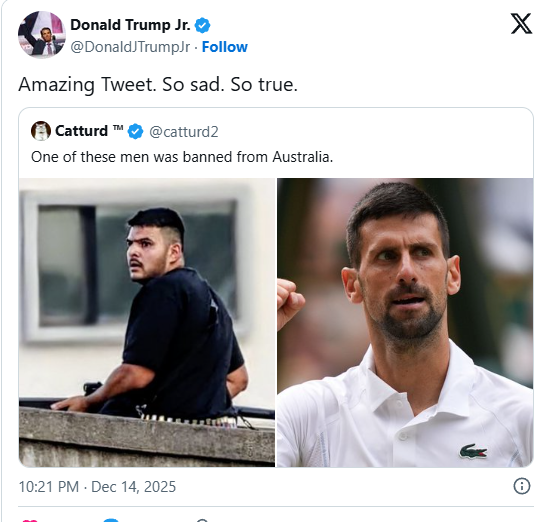 U toj objavi korisnik je podelio fotografije jednog od napadača iz Sidneja i Novaka Đokovića, uz komentar: