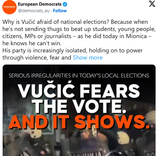 U objavi na Iksu, evropske demokrate su sinoć istakle da se Vučić „plaši nacionalnih izbora zato što, kada ne šalje batinaše da prebijaju studente, mlade ljude, građane, poslanike ili novinare, kao što je uradio u Mionici, zna da ne može da pobedi“.