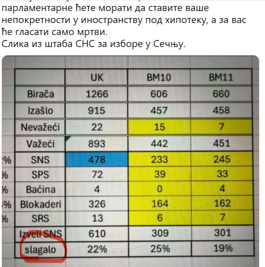Studenti Pravnog fakulteta u Novom Sadu objavili su tabelu za koju tvrde da potiče iz SNS-a, a na kojoj je zabeleženo koliko ih je građana koji su im na nedavnim izborima u Sečnju obećali glas – na kraju prevarilo. Iz prikazanih podataka proizlazi da je reč o čak 22 odsto.