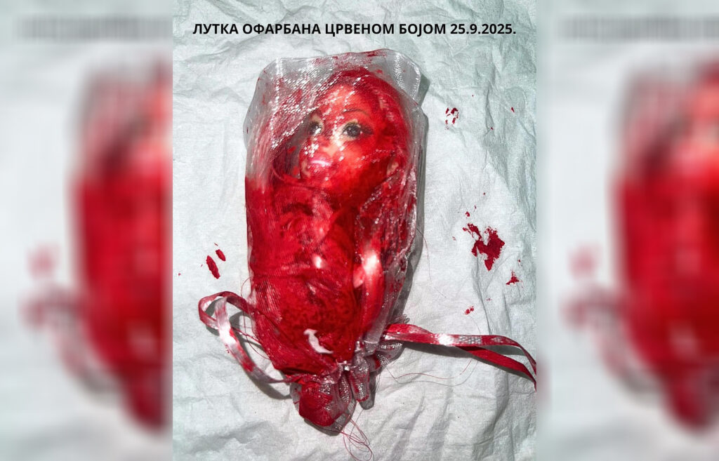 U objavi su priložili i fotografiju lutke prekrivene crvenom bojom, umotane u najlon kesu, za koju navode da ju je koleginica pronašla na radnom mestu.