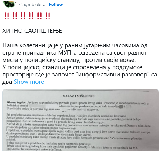 “Našoj koleginici je dat papir nepoznate sadržine i prećeno joj je da isti potpiše. Kada je to odbila, usledila je fizička i psihička tortura. Uniformisani pripadnik MUP-a je njenu glavu iz sve snage udario o sto, pri čemu joj je pocepana arkada. Nakon toga je udarena pištoljem u predelu kuka. Zatim je vezana jednom rukom za radijator, a druga je ostala slobodna kako bi papir mogla da potpiše, što je ona ponovo odbila da uradi”, naveli su studenti Poljoprivrednog fakulteta u blokadi.