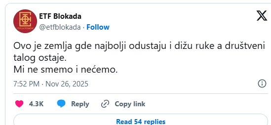 „Ovo je zemlja gde najbolji odustaju i dižu ruke a društveni talog ostaje. Mi ne smemo i nećemo“, poručili su studenti na profilu ETF Blokada.