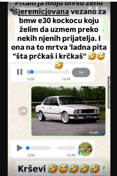 “Pitam ja moju bivšu ženu Jovanu Jeremić, vezano za BMW E30 kockicu koju želim da uzmem preko nekih njenih prijatelja. I ona na to mrtva ‘ladna pita: ‘Šta prčkaš i krčkaš'”, napisao je Voja.
