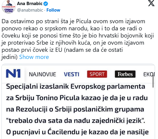 Predsednica Skupštine Srbije, Ana Brnabić oglasila se danas na društvenoj mreži “X” gde je komentarisala izjavu Tonina Picule koji je u intervjuu govorio o Rezoluciji o Srbiji i jučerašnjem incidentu ispred Skupštine Srbije u kome je jedna osoba zadobila teške telesne povrede.