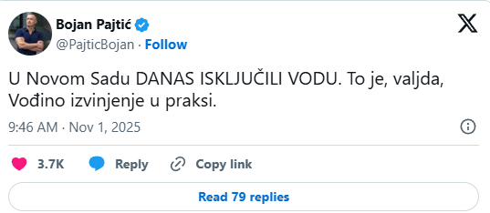 „U Novom Sadu DANAS ISKLJUČILI VODU. To je, valjda, Vođino izvinjenje u praksi“, napisao je Pajtić.