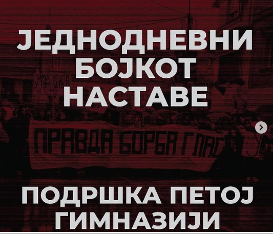 Učenici Prve beogradske gimnazije odlučili su da jednodnevno bojkotuju nastavu u ponedeljak, 20. oktobra, kao znak solidarnosti sa učenicima Pete beogradske gimnazije. Ovu odluku su većinom glasova doneli i najavili putem društvenih mreža.