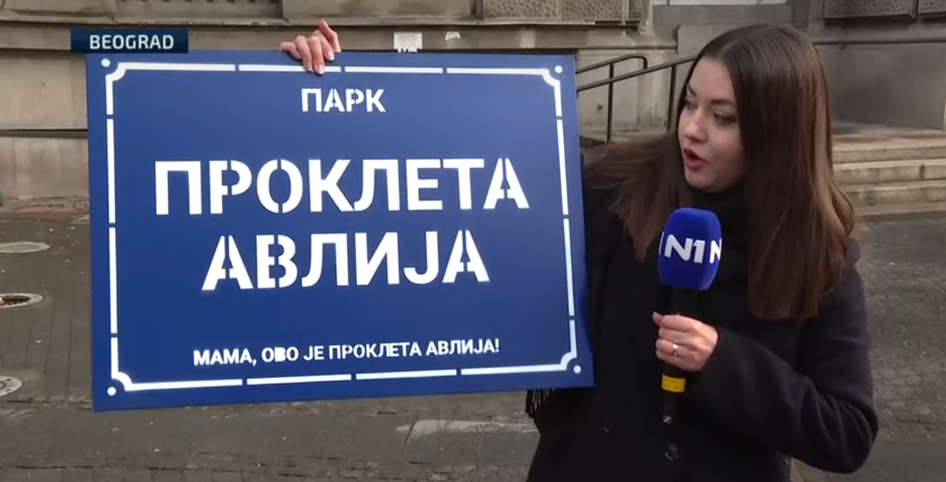 Umetnik i arhitekta Andrej Josifovski Pijanista juče je izveo umetničku „intervenciju“ na ogradi Ćacilenda, gde je okačio tablu sa natpisom park „Prokleta avlija“, koja je ubrzo uklonjena. On je za N1 izjavio da u ovoj državi, kako kaže, očigledno nema problema kada je sedam policajaca dva sata čuvalo jednu tablu.