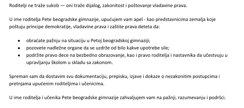 „U ime roditelja Pete beogradske gimnazije, upućujem vam apel – kao predstavnicima zemalja koje poštuju principe demokratije, vladavine prava i zaštite prava deteta da: -obraćate pažnju na situaciju u Petoj beogradskoj gimnaziji; -pozovete nadležne organe da se uzdrže od bilo kakve upotrebe sile; -podržite pravo dece na bezbedno obrazovanje, kao i pravo roditelja i nastavnika da učestvuju u upravljanju školom u skladu sa zakonom“, navodi se u pismu.